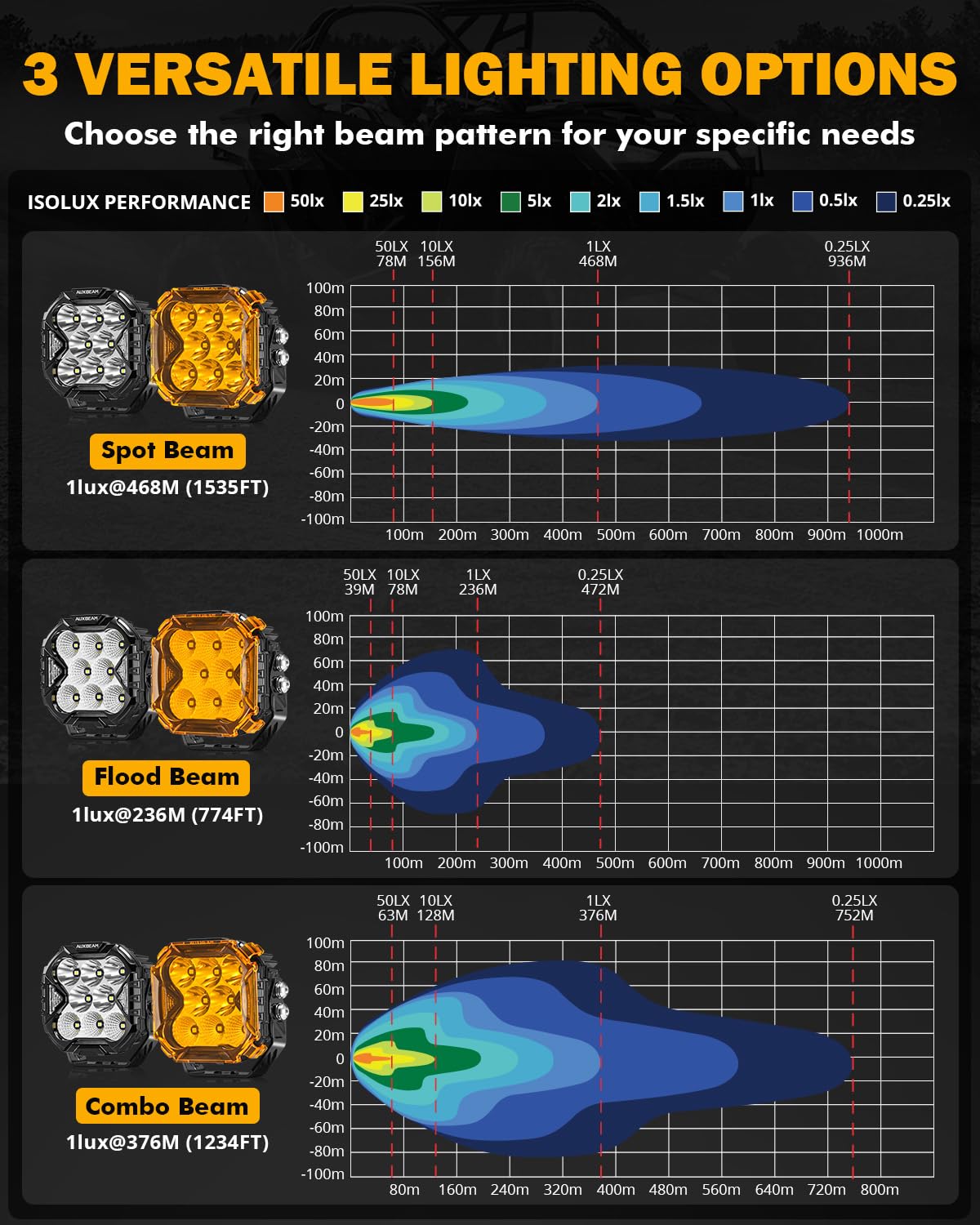 - 【TRUSTED DRIVING VISION】Multi-function led pod lights feature two types of LEDs: P8 and 3030 SMD chips. With a powerful 112W output, they deliver 12,800 lumens and a lighting distance of 1lux@376M (1234 feet). They provide intense, natural light with a 6500K white beam and a 3000K yellow beam, ensuring a farther and wider illumination range for safe night driving.