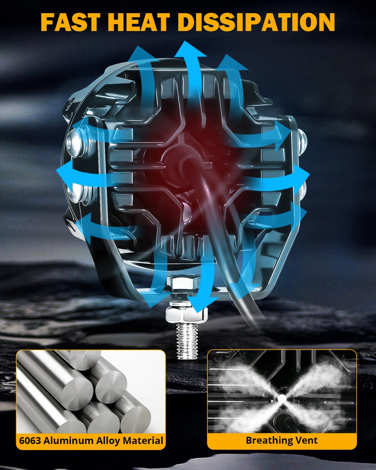 - 【EXCELLENT EFFICIENT COOLING】The Driving Light is built with heavy-duty 6063 die-cast aluminum material and a hardened PC lens. This design accelerates heat dissipation and maintains a safe temperature, ensuring stable lighting output and durability. With a lifespan of over 50,000 hours, you can trust our lights to last.