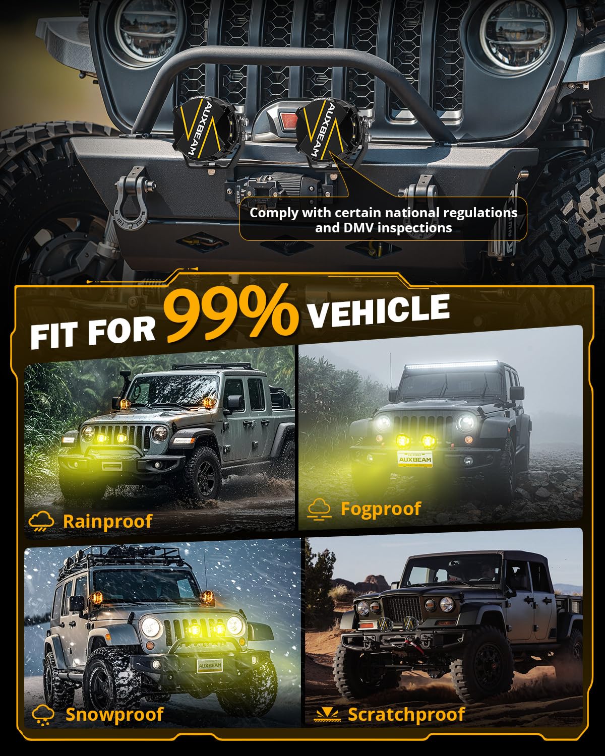 - 【MULTIFUNCTIONAL & COST-EFFECTIVE】The LED driving lights provide 3 different lighting modes, you can choose different ambient lighting, including Yellow Main Light, Amber DRL or Turn Signal. We also provide two black protective covers. Not only do they enhance your vehicle's style and off-road appeal, but they also ensure compliance with state regulations and DMV inspections, keeping your lights road-legal.