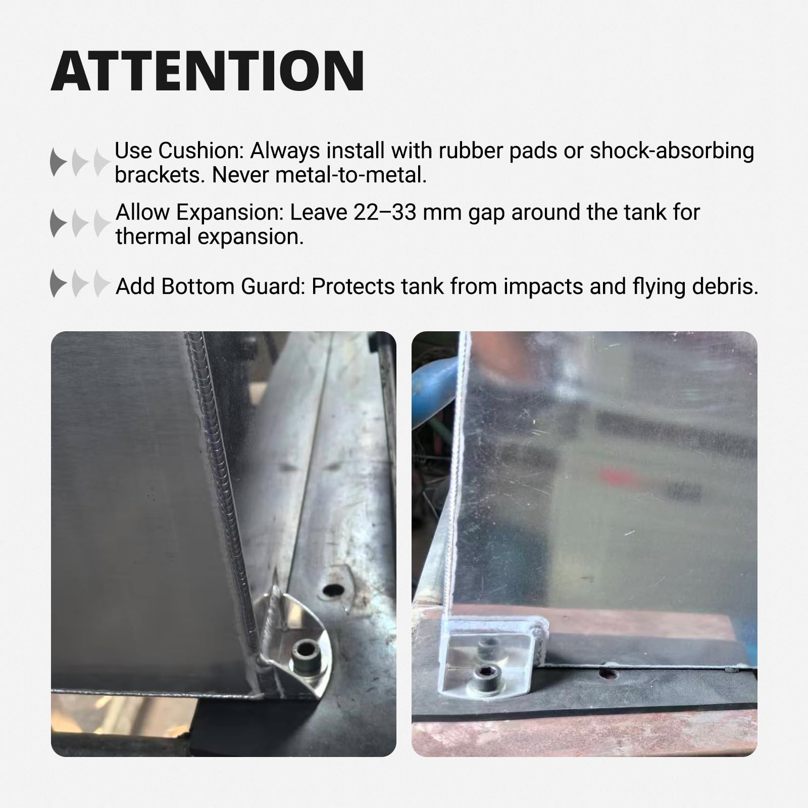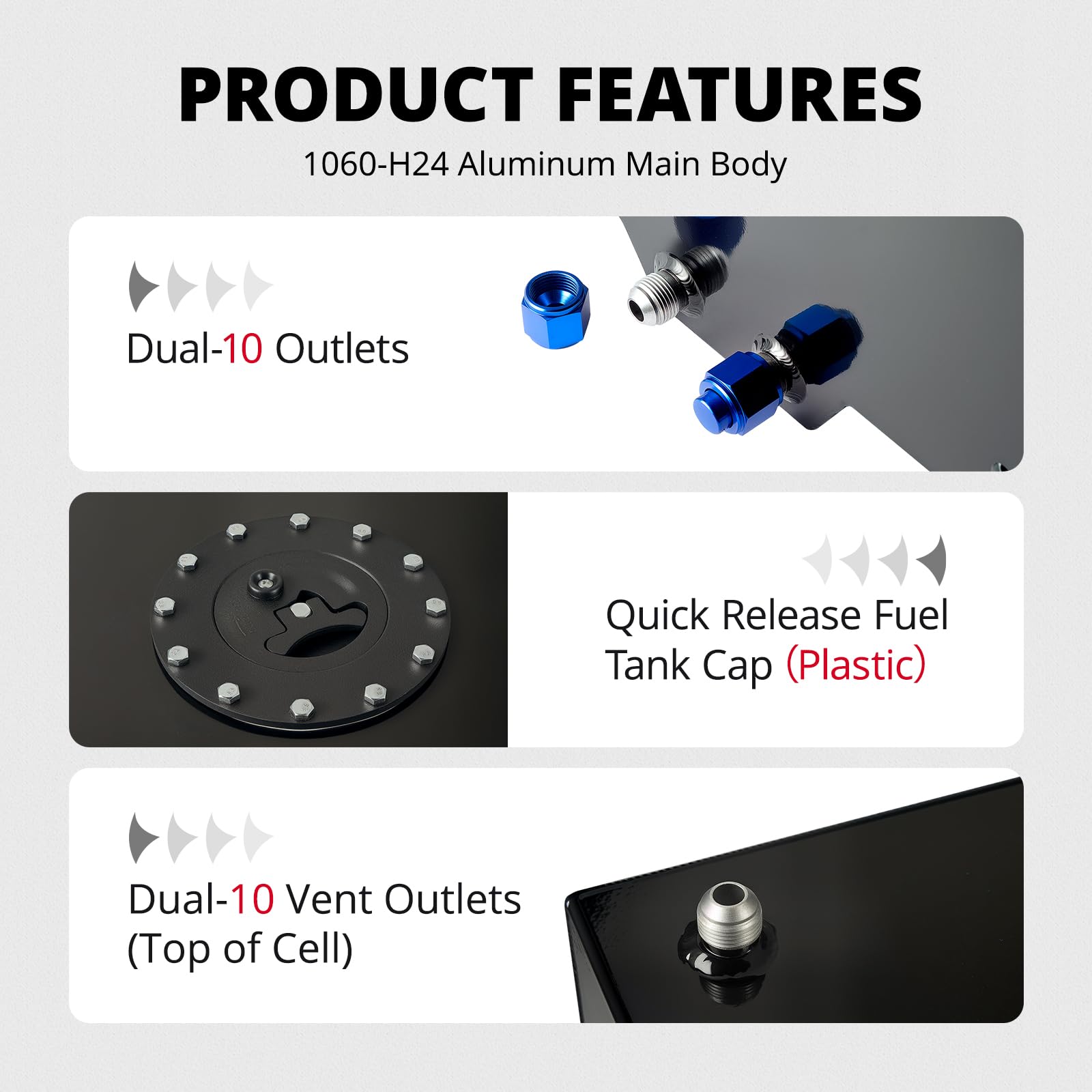 - Material: The drift fuel cell tank is made of 1060-H24 aluminum alloy, and the cover is made of plastic.