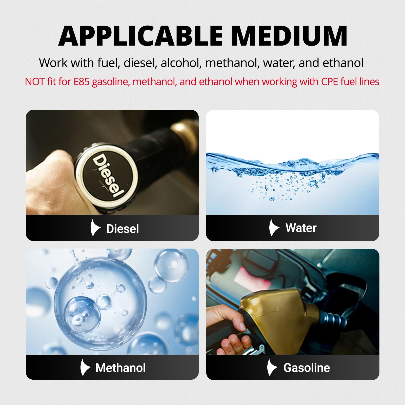 - Application: This gas fuel cell is compatible with fuel,diesel, alcohol, methanol, water and ethanol, not fit for E85 gasoline, methanol and ethanol when working with CPE fuel lines.