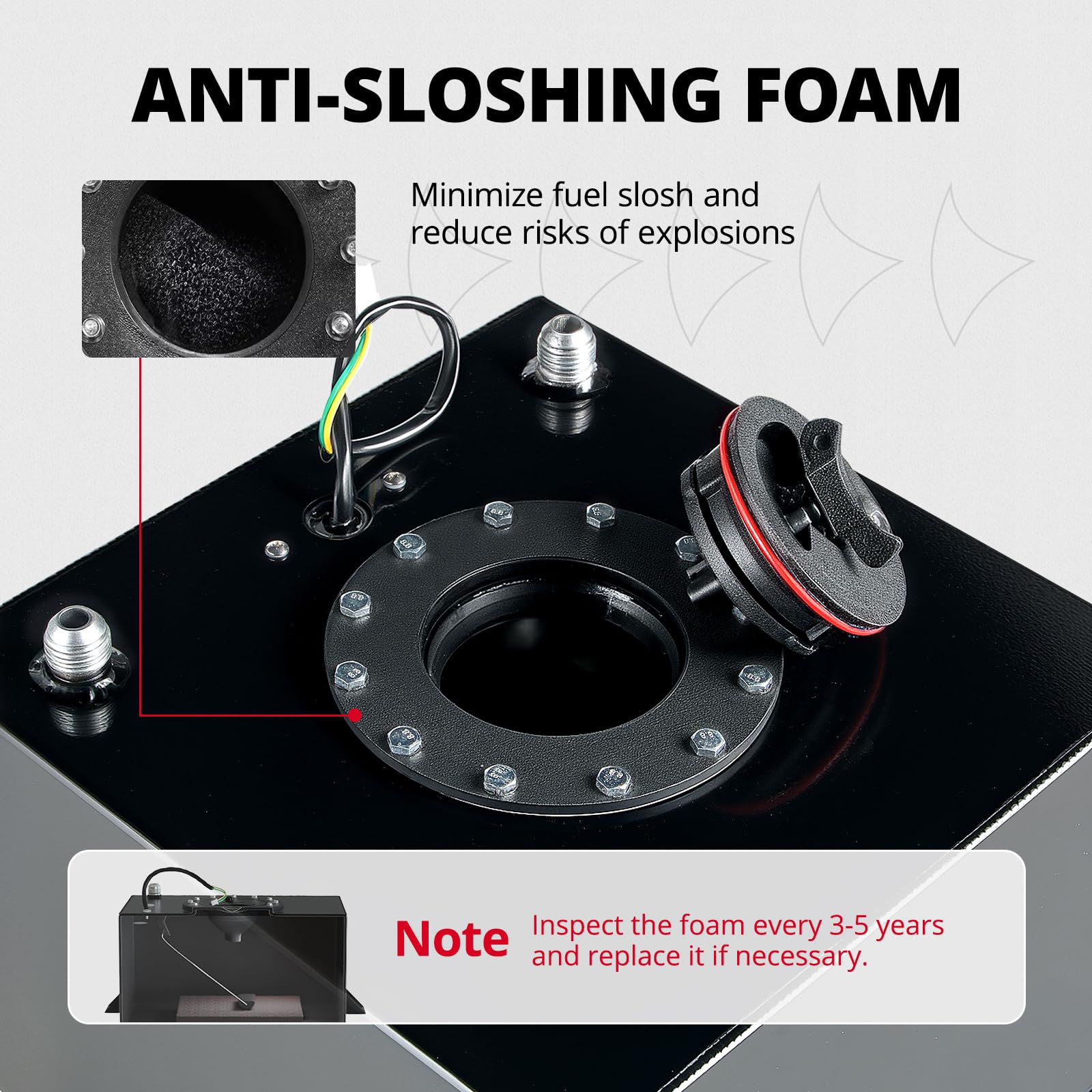 - Note: Anti-slosh foam is built inside the fuel cell tank to improve fuel delivery and prevent flashback explosions. Please check the foam regularly for deterioration.